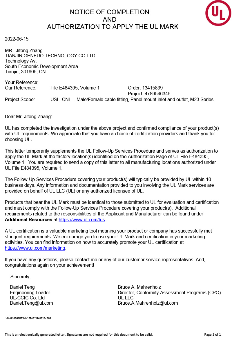 M12-UL Certificate