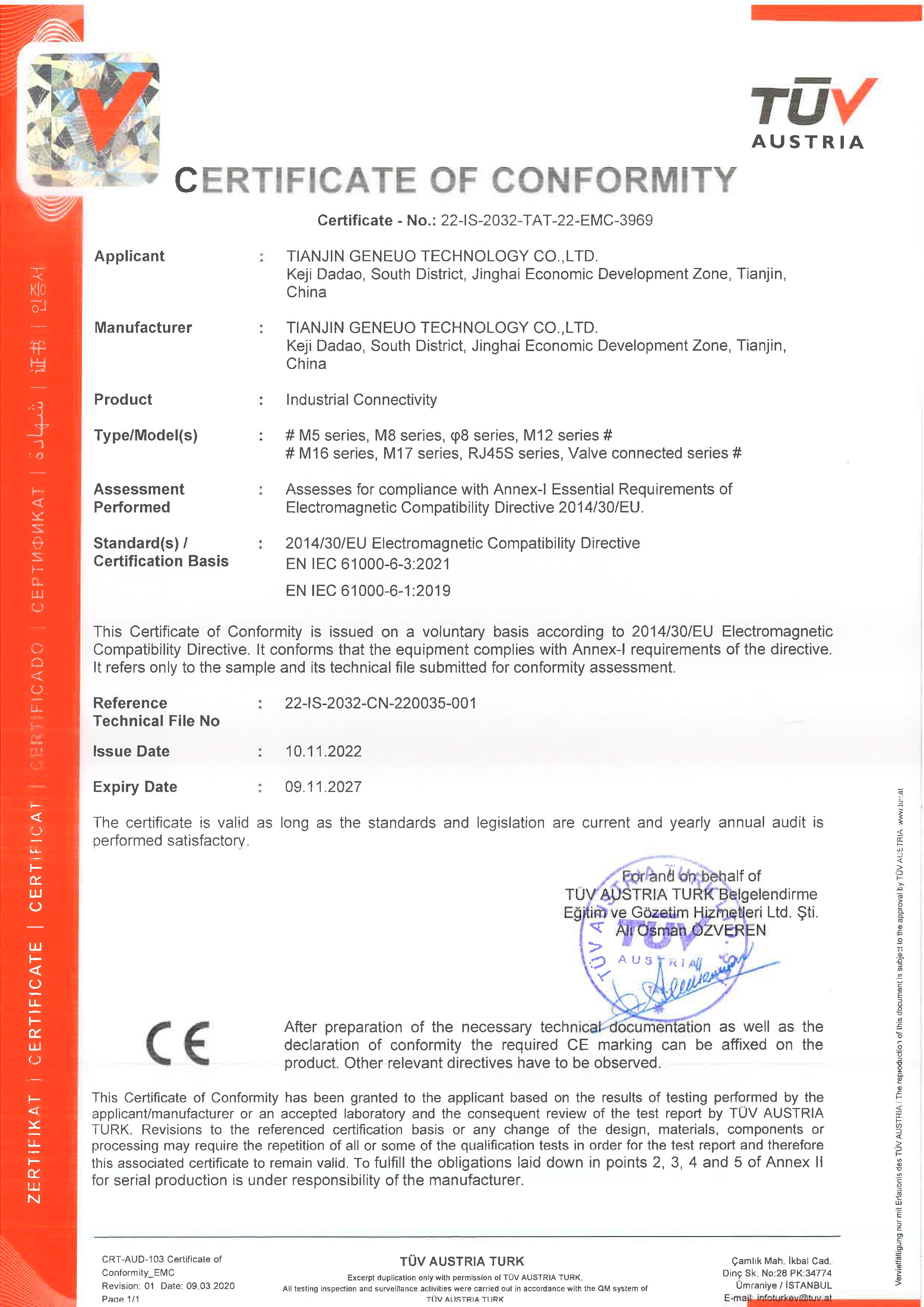 圓形工業(yè)連接器Industrial connectivity1-CE Certificate (01-101122)